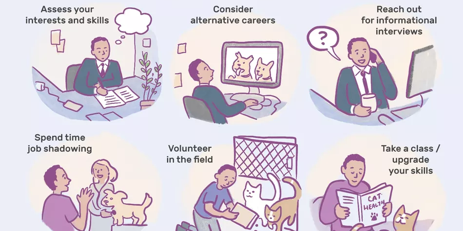 Assess your interests, values, and skills. Review past successful roles, volunteer work, projects and jobs to identify preferred activities and skills. Determine whether your core values and skills are addressed through your current career. There are free online tools you can use to help assess career alternatives.